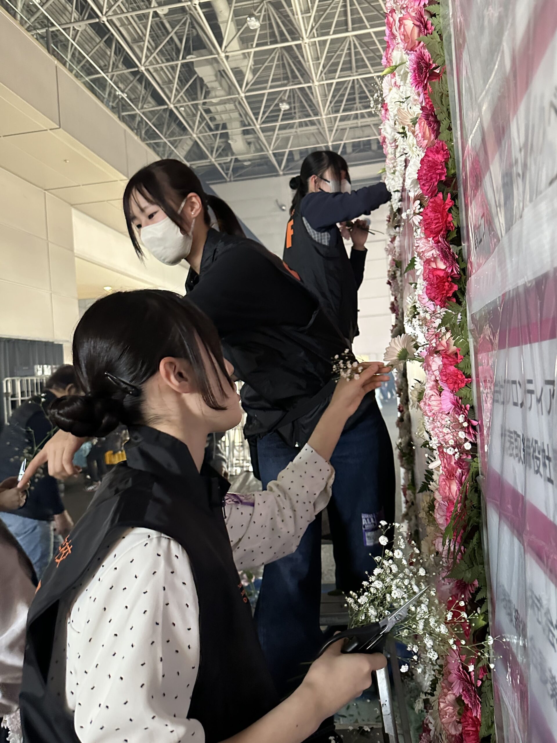 フラワーデザイン科の学生たちは、会場の入口に設置されたウェルカムボードのフラワー装飾を担当し、