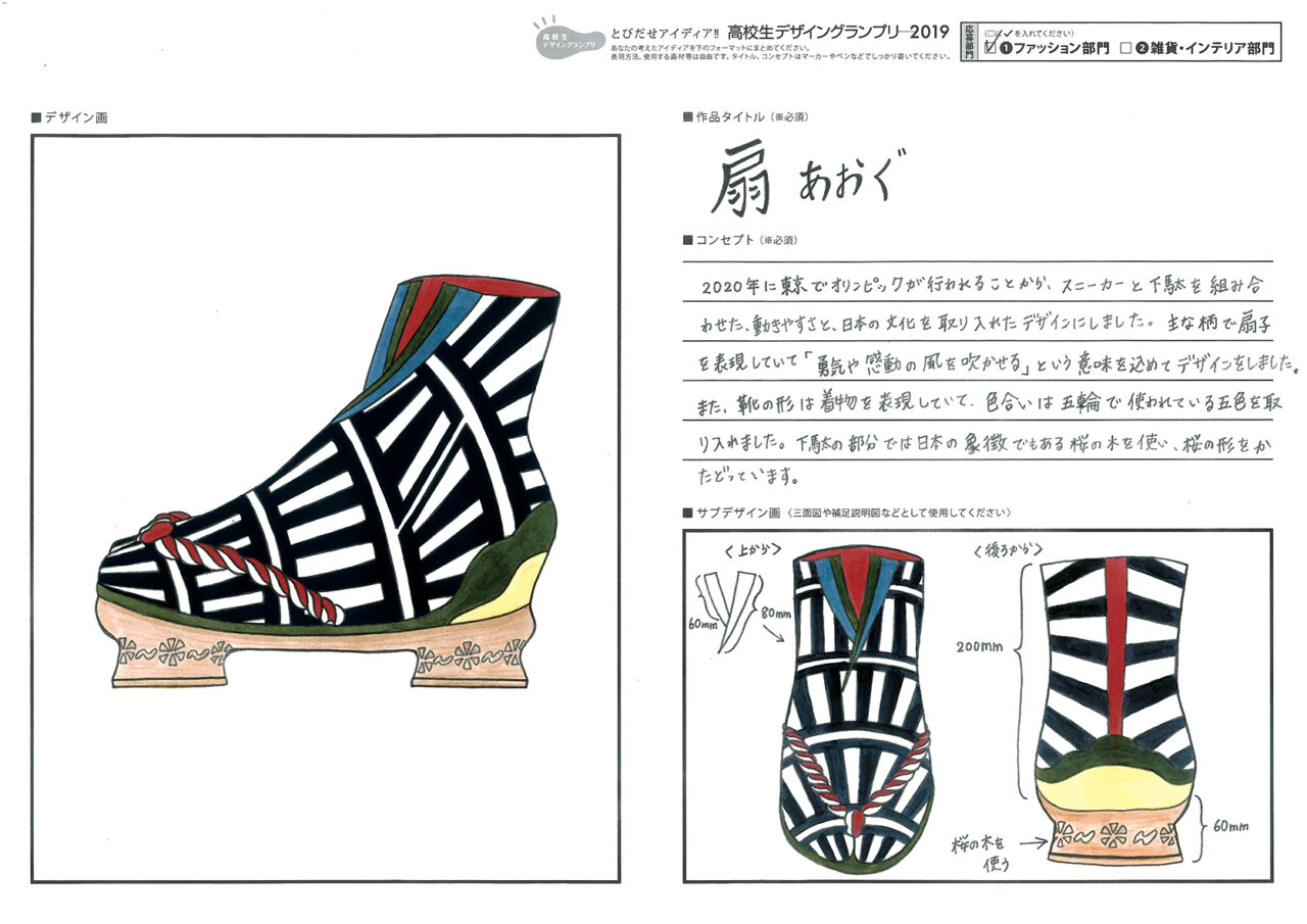 「扇ぐ」のコンセプト通り、心にぐわんと風を吹かせて躍らせるかぶき者なシューズ。強いインパクトを持ったイラストにグイグイ引き込まれました。躍動する柄や色彩もさることながら、それでいて「和」の域に収まらないモード感も感じます。隆々とした男性の足にも、しなやかな女性の足にも合う、スマートさも持ち合わせたデザイン。 オリンピックイヤーを迎え、日本の伝統意匠がこのようにますます解釈を拡げていくことと期待も感じています。