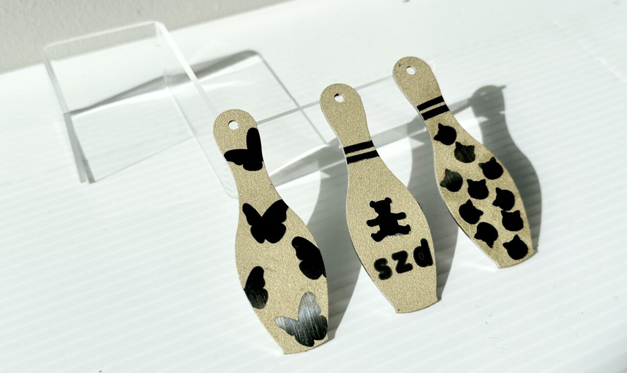 ボーリングのピンをモチーフにしたストラップ。アルミや真鍮に溶射加工を施し、金属ならではの輝きと質感を表現しました。